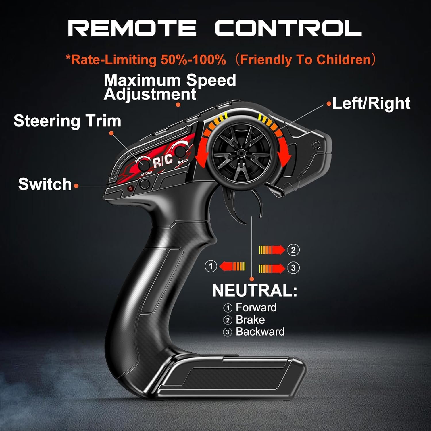 Transmitter: TRIM and SPEED button on the 2.4GHz anti-interference controller. The car’s speed and steering can be controlled proportionally based on the real car great for beginners.
