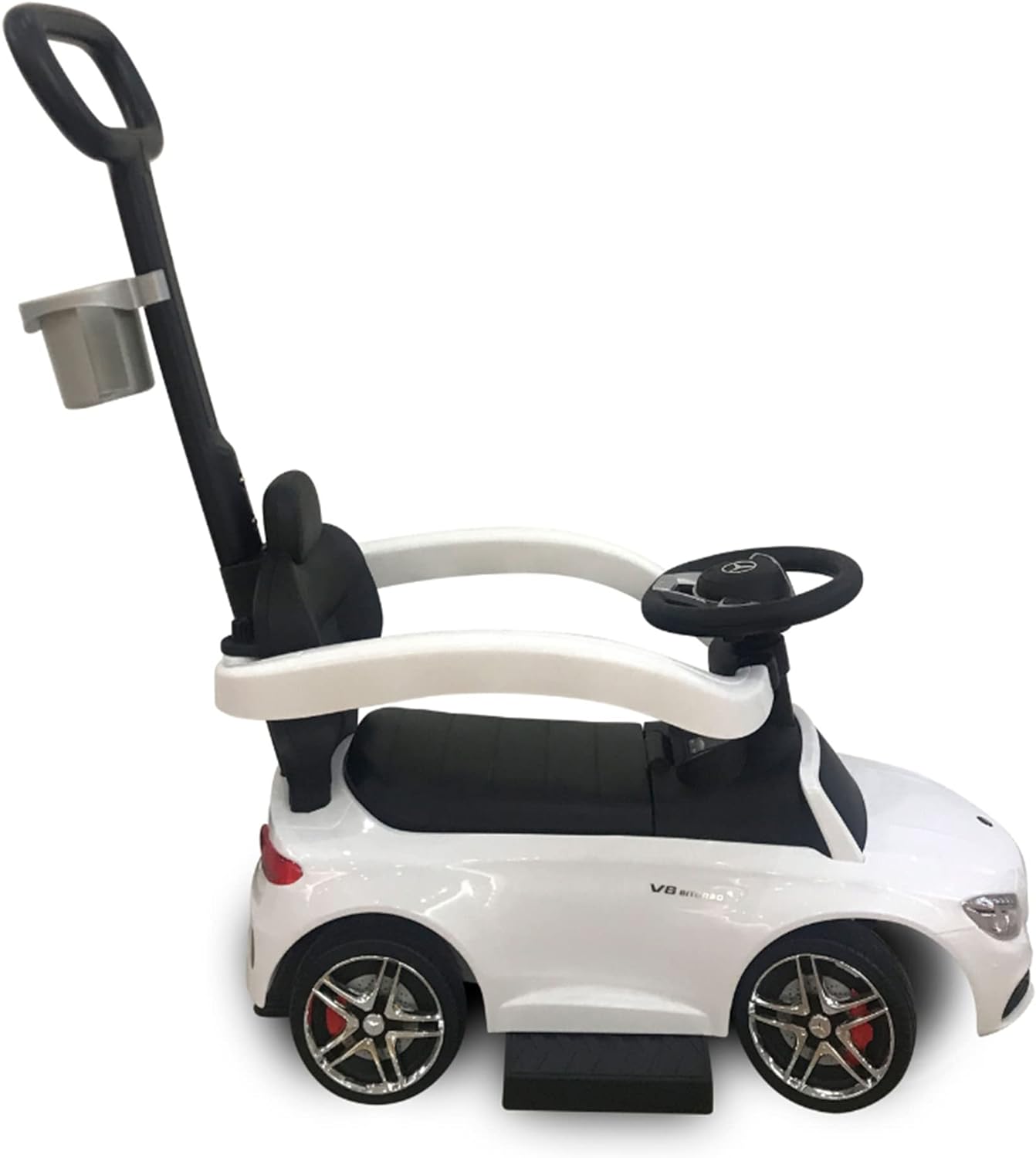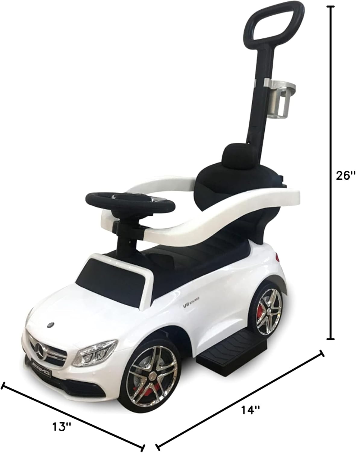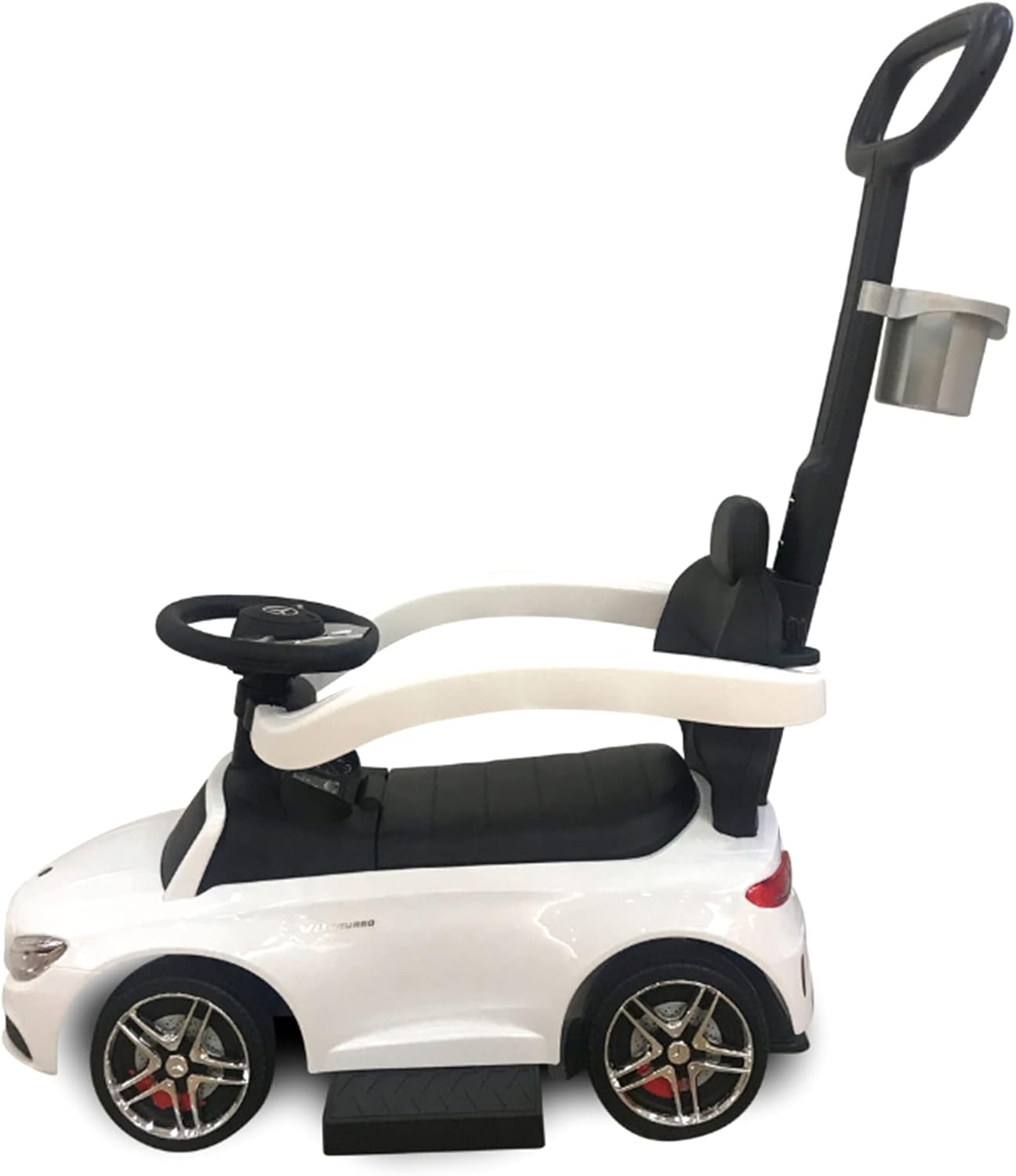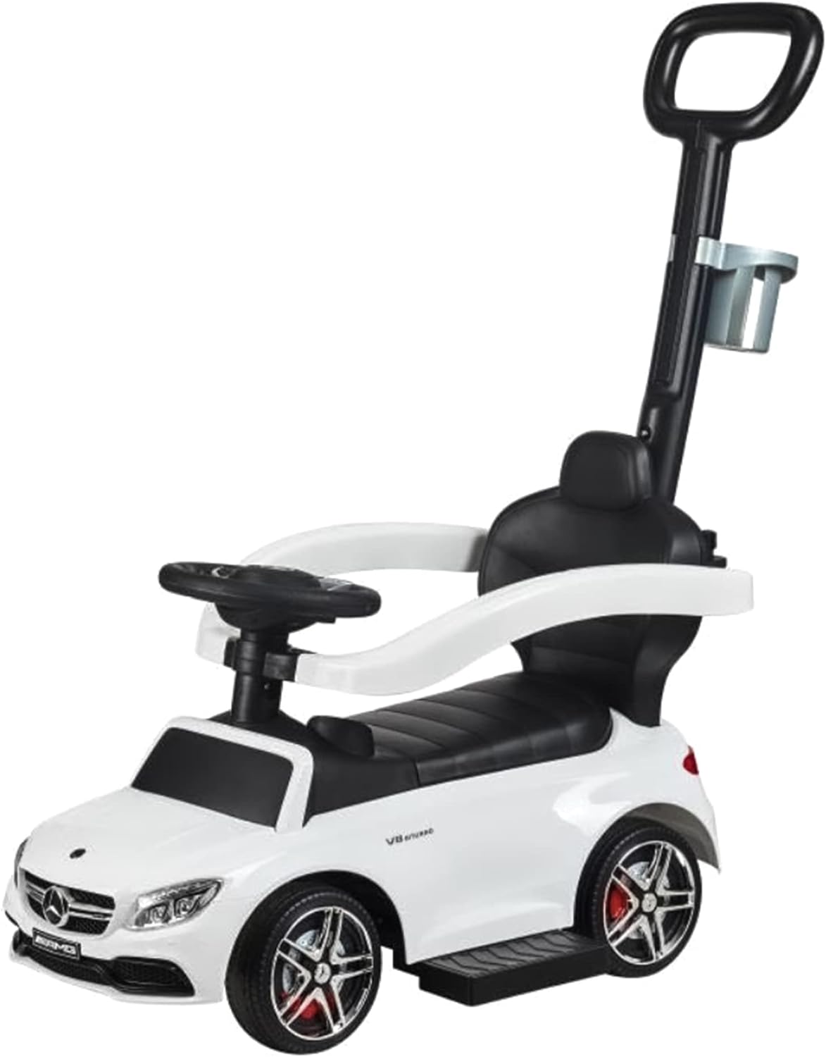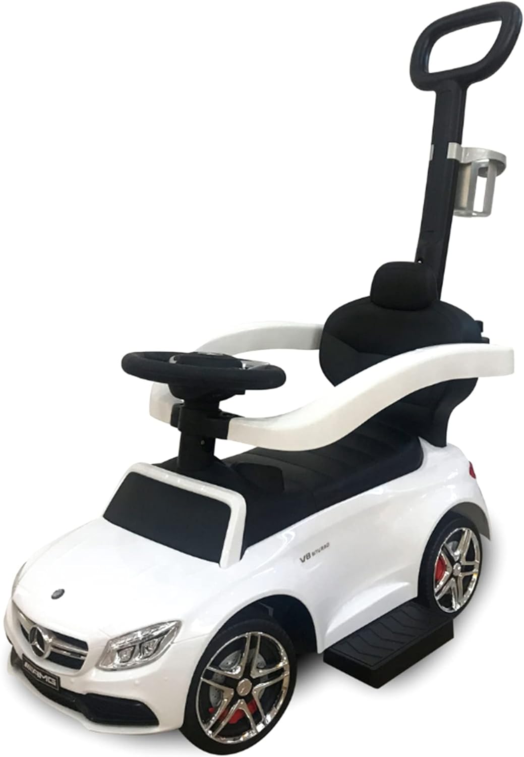 Your little one can start living the life of luxury early with this Best Ride On Cars Mercedes AMG C63 3-in-1 Push Car. Featuring a backrest, working horn, and a footrest for an easy climb, your child will enjoy the ride around the neighborhood. Suitable for ages 18 months -3 years old. Perfect foot-to-floor pedal push car for your little one to use indoors and outdoors, it comes with under-seat storage to store little toys and a cup holder. Has a removable stroller bar, handlebars, and a footrest for comfort. Working music and horn sounds.