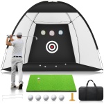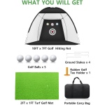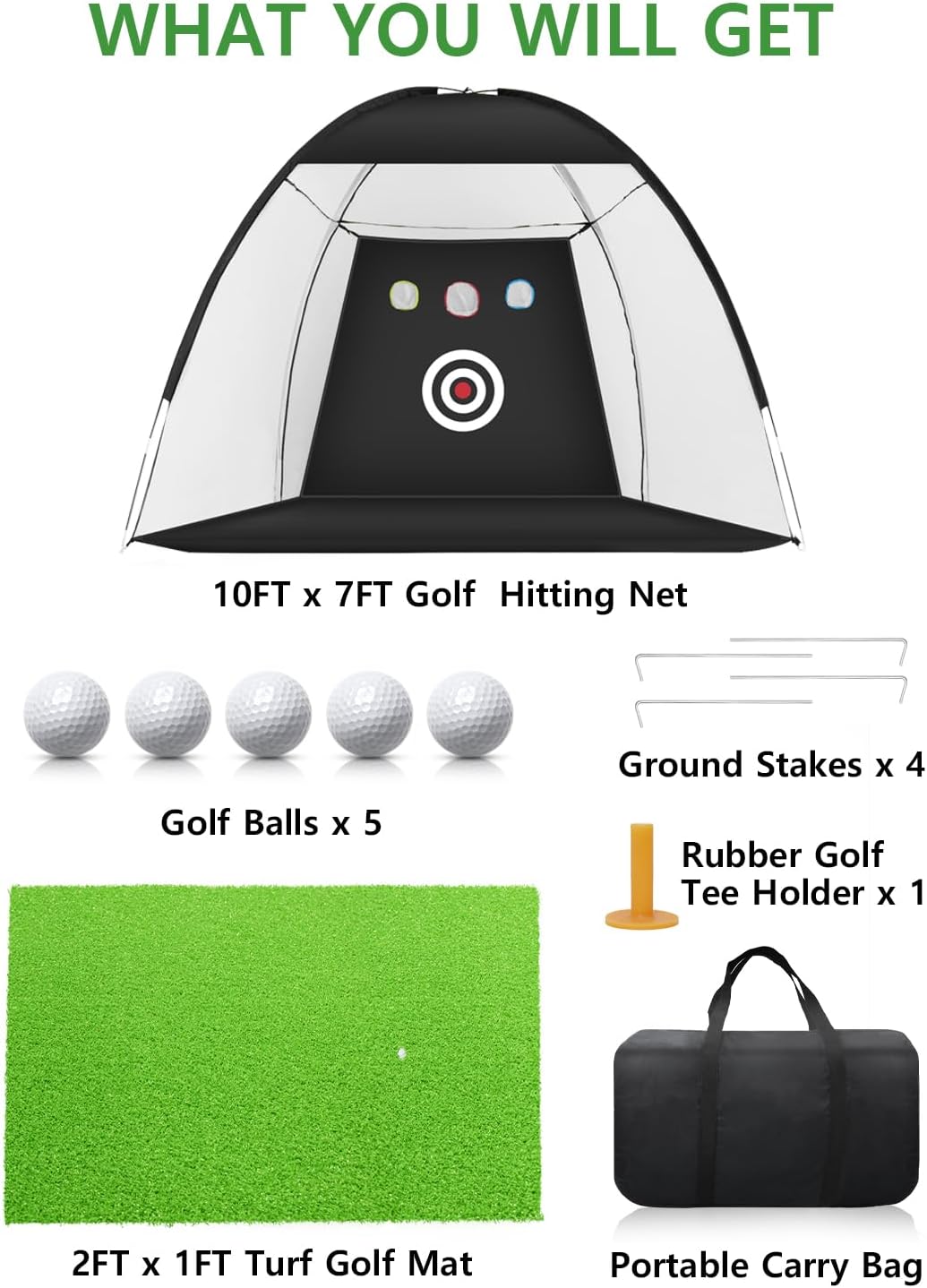 【What You Will Get】 Our golf training net comes with 10 x 7 x 6 ft (W*H*D)Golf Hitting Net,1 x golf tee,5 x golf balls, 1 x golf hitting mat, and 1 x carry bag. Home sports game golf swing training nets with targets All-in-One, Ideal golf training aid for men/boys, golf beginners, and golf lovers.