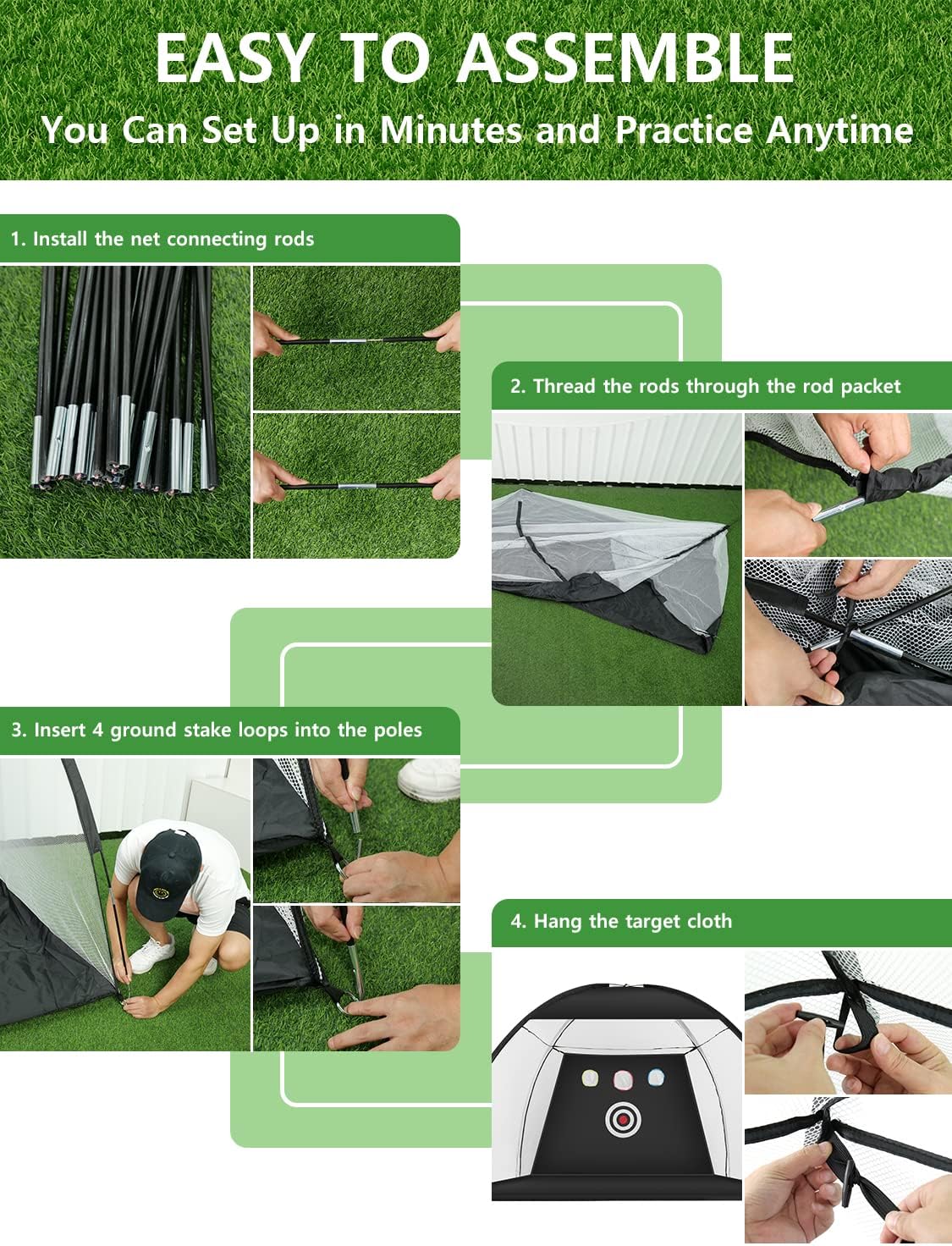 【Easy to Assemble & Take Apart】Our golf net is very easy to assemble, it sets up easy with two crossing poles, much like a dome tent, anyone can do it. Takedown is also easy, just push the poles out instead of pulling.