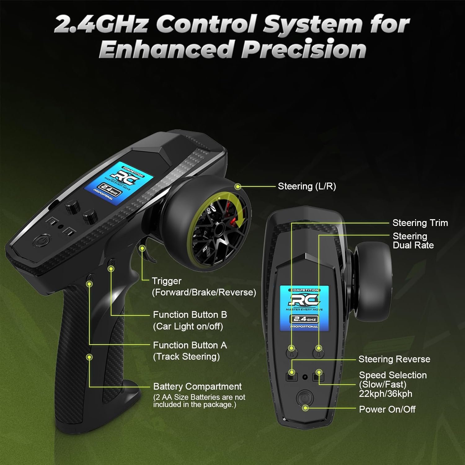 The upgraded RC circuit system includes a 2.4GHz remote control with added features like overheat protection, anti-jam cut-off, and splash-proof waterproofing. With a control range of over 280 feet and upgraded electronic components, it’s built for durability. (Note: New and old controllers are not compatible.)