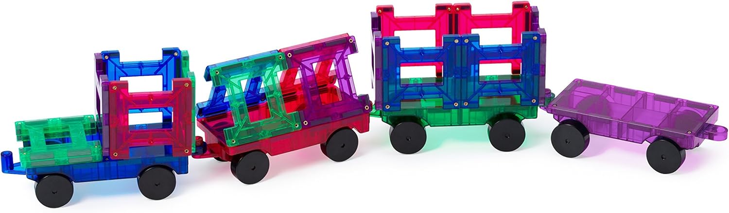 55-PIECE MAGENTIC TILES SET: Includes a variety of shapes and components such as 10 squares, 10 windows, 10 rectangles, 16 tracks, 5 click-ins windows, and 4 connecting cars for endless creative possibilities.