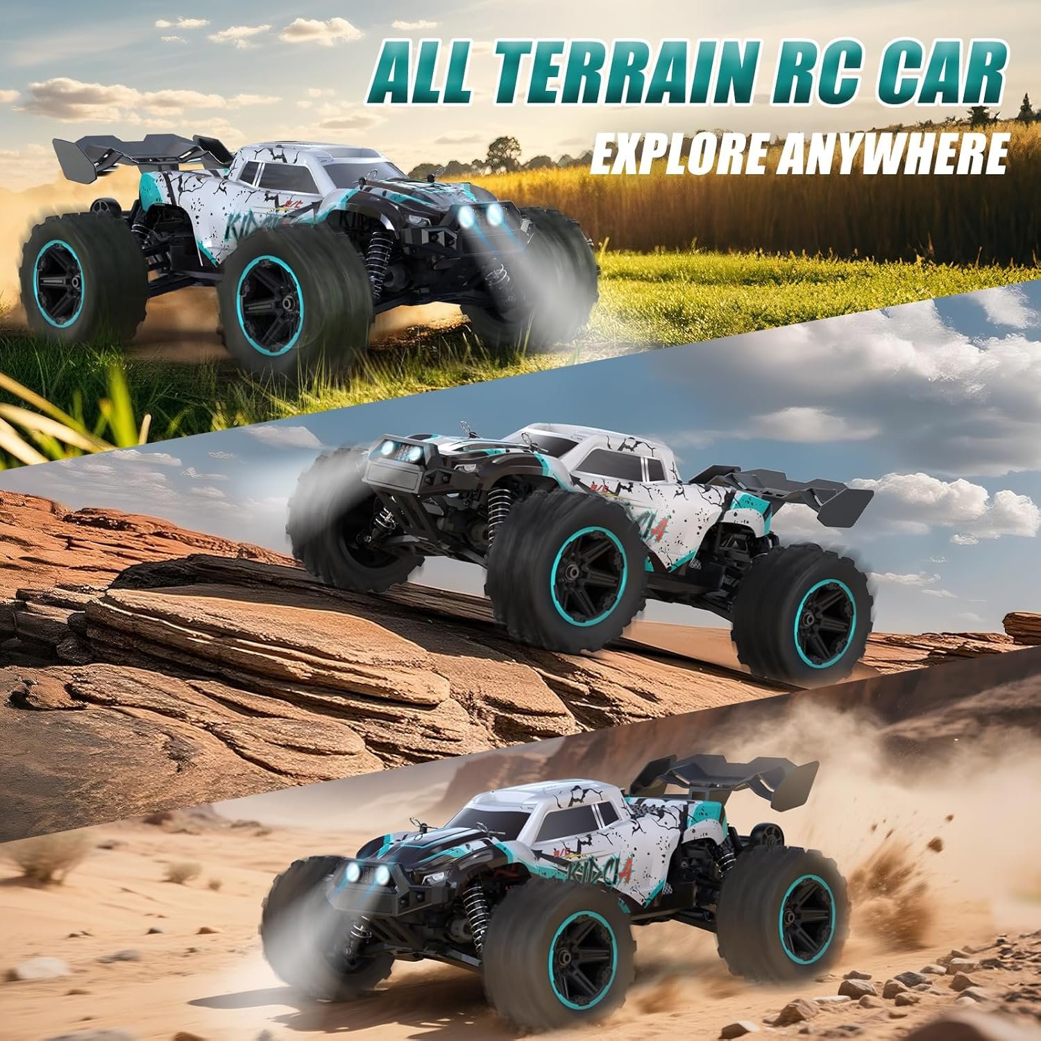All-Terrain Dominance: Built to handle various types of terrain, our RC cars for adults feature a durable PVC body and a reinforced chassis that enhances impact resistance. Four independent metal shock absorbers and wide, wear-resistant tires help absorb bumps and handle rough conditions with ease. Coupled with a 4-wheel drive system, these fast rc car power through mud, short grass, sand, gravel,and uneven surfaces in many weather conditions.