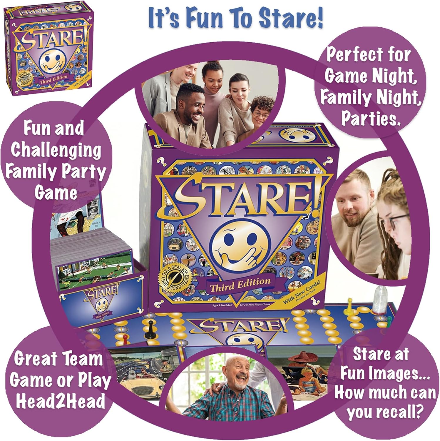 Stare! is the perfect choice for adults & family game nights. Recommended for ages 15 & up. Suitable for 2 or more players/teams.